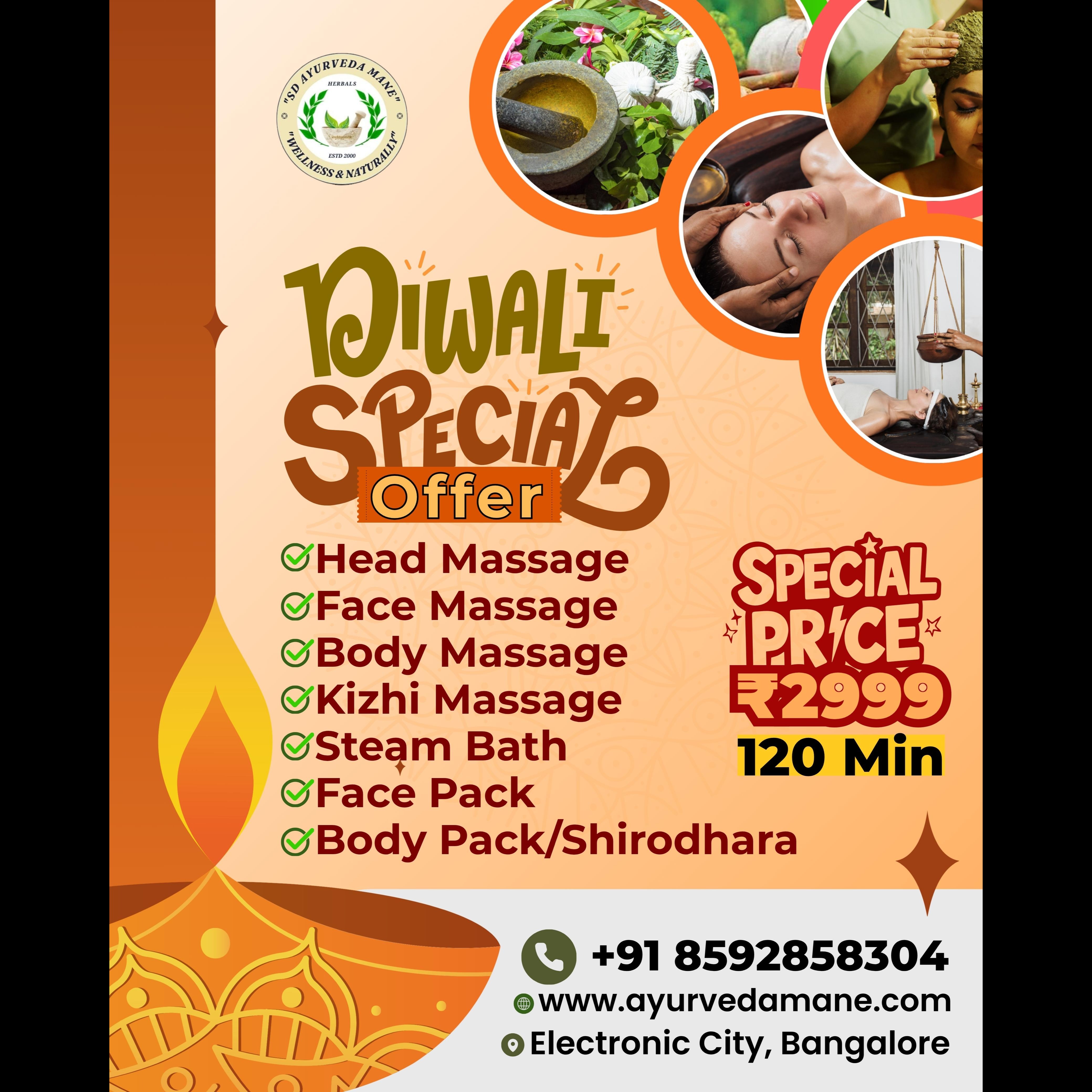 Avail our Diwali Special Offers on Ayurvedic body massages, detox therapies, stress relief, and holistic treatments at SD Ayurveda Mane – Holistic Wellness Center, Electronic City.