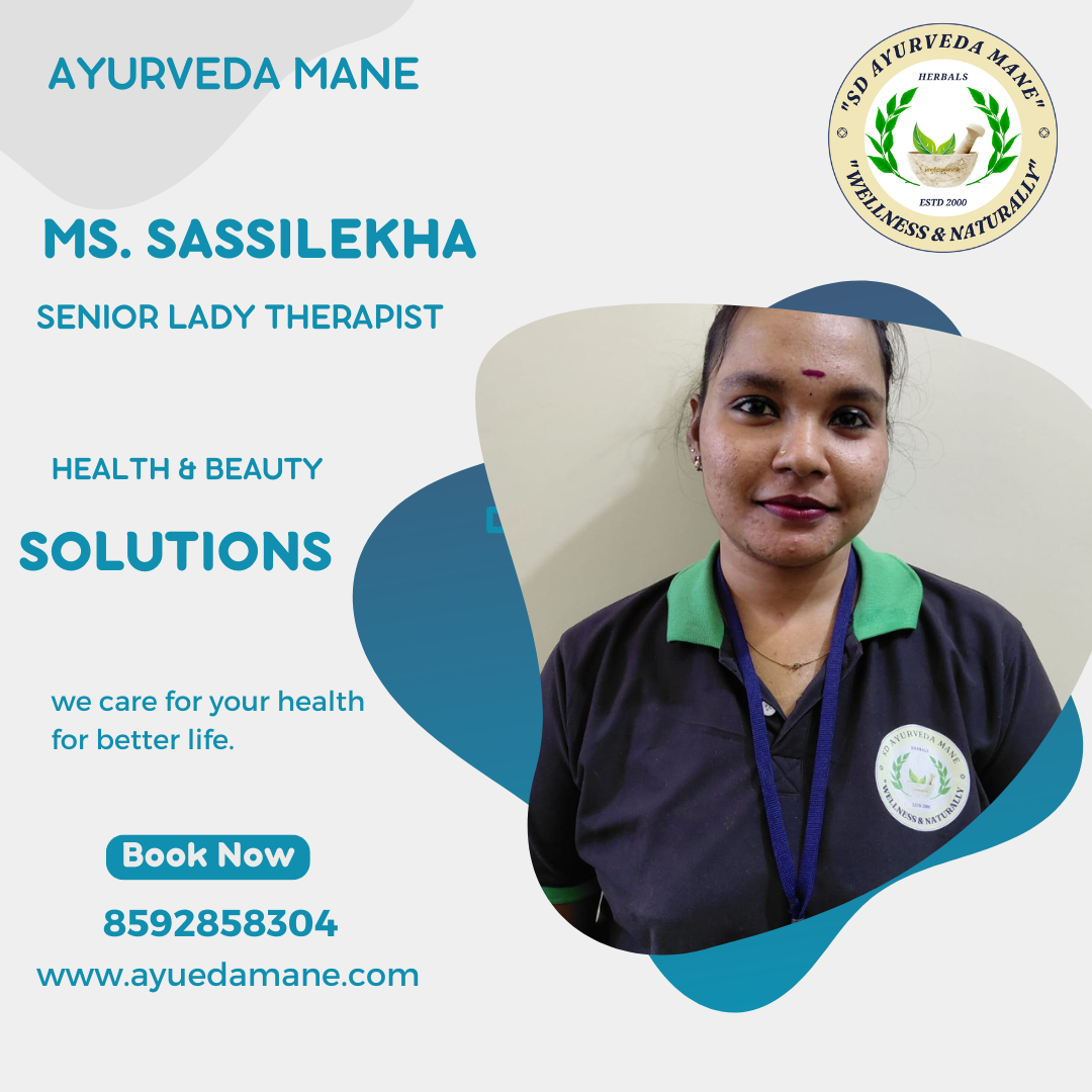 At SD Ayurveda Mane, Electronic City, our Senior Lady Therapist Ms. Sassi Lekha offers expert Ayurvedic and wellness therapies designed to restore balance, relieve pain, and enhance natural beauty. With her professional skills and compassionate care, she provides Body Massage, Pain Relief Therapy, Weight Loss Treatments, Postnatal Mother & Baby Care, and complete Ayurvedic Panchakarma Therapies.